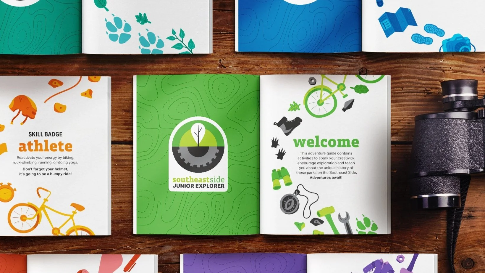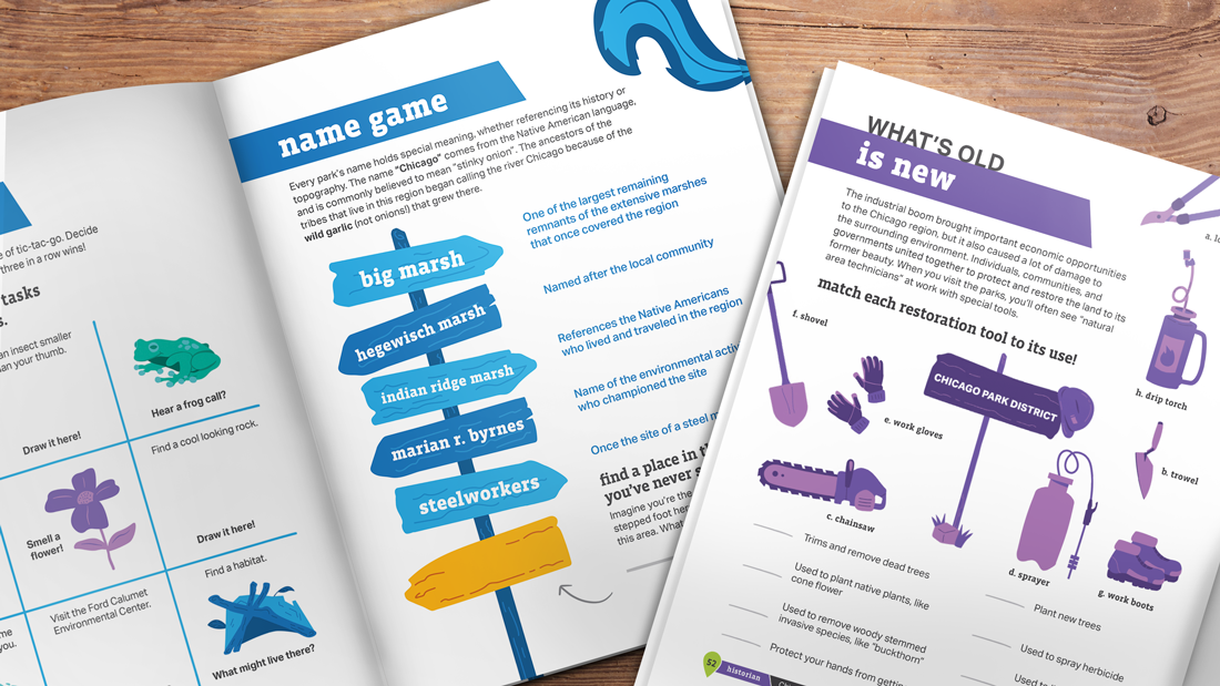 The Chicago Parks District’s Southeast Side had went through a period of land reclamation, development and transformation recently. Through this effort the steel mills, brownfields, and forgotten lands were turned into areas for exploration and learning, allowing park visitors to learn the location’s rich industrial and natural history. Design B&B earned the opportunity to work with the Chicago Parks District Southeast Side which included developing a full identity system for the park, a website, and marketing materials. The most special deliverable in this project for me—and the one I most worked on—was helping design and illustrate a junior activity print book (or booklet) that prompted young park visitors to participate in challenges and games. These activities pushed them to interact with their environment while also learning the land’s roots in the US steel industry, identifying its local flora and fauna, and testing their athleticism.
